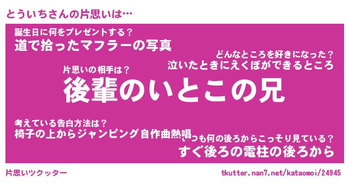 | 意味不明あだ名 | 『ペロリンとういち』『永久保存とういち』 |