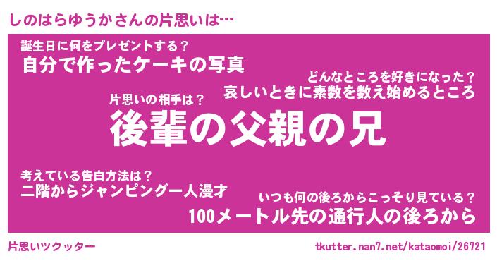 | 女子向けラノベタイトル風あだ名 | 『誰かこのしのはらゆうかを説明してください! ~契約から始まるウェディング~』 |