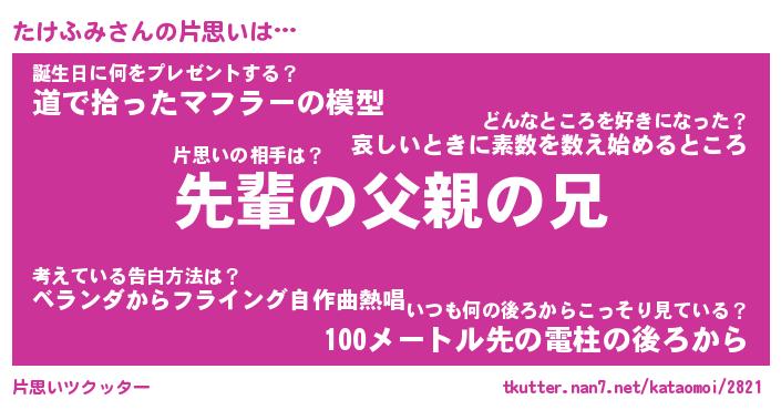 | 男性向けラノベタイトル風あだ名 | 『たけふみの憂鬱』 |