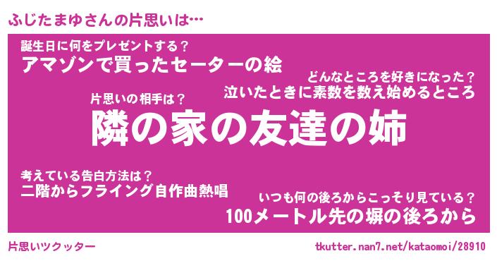 | 伝説のあだ名 | 『伝説のスナイパーふじたまゆ』 |