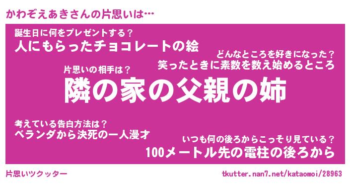 | 女子向けラノベタイトル風あだ名 | 『(仮)かわぞえあきのやんごとなき事情』 |