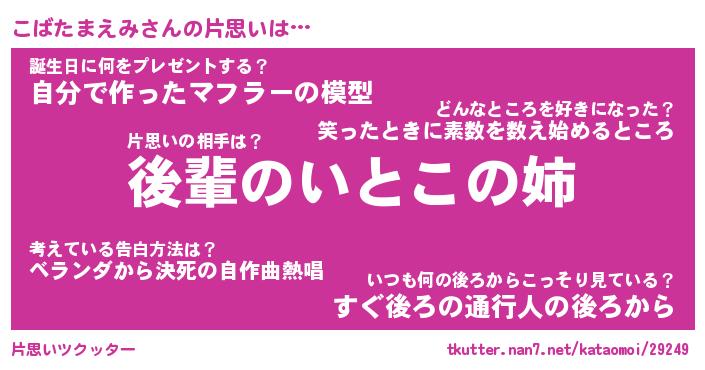 | ヘコむあだ名 | 『こばにゅー』『つくし』 |