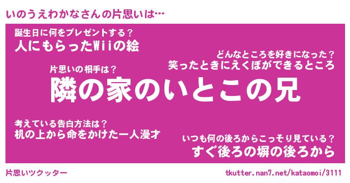 | 男性向けラノベタイトル風あだ名 | 『いのうえわかなの憂鬱』 |