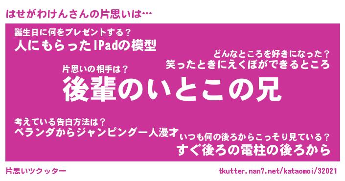 | ヒーロー風カッコイイあだ名 | 『スーパーハセガワケン』『天弓騎士ハセ』 |