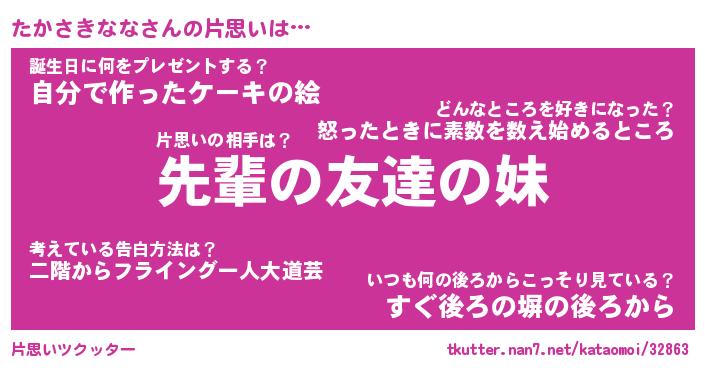| 男性向けラノベタイトル風あだ名 | 『たかさきななの憂鬱』 |