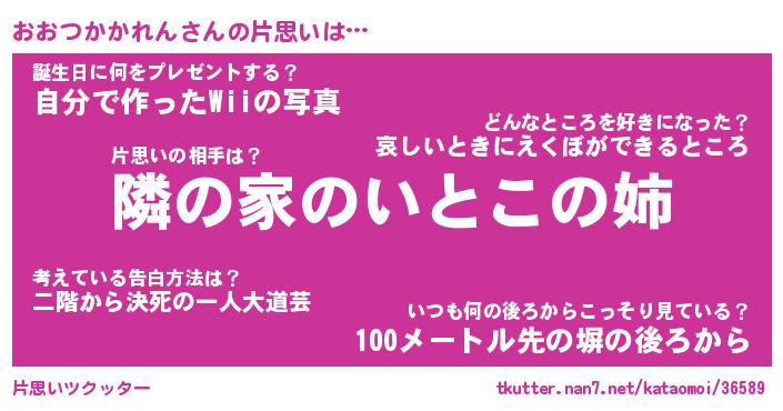 | 男性向けラノベタイトル風あだ名 | 『おおつかかれんの憂鬱』 |