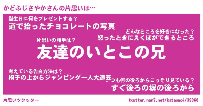 | 男性向けラノベタイトル風あだ名 | 『カドフジサヤカアートオンライン』 |
