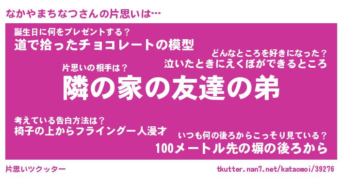 | 男性向けラノベタイトル風あだ名 | 『なかやまちなつの憂鬱』 |