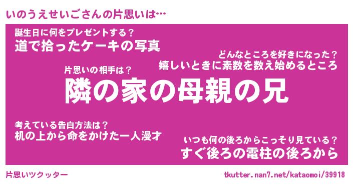 | 胡散臭い通販商品みたいなあだ名 | 『必ず成功するブレスレット…その名も「いのうえせいご」』 |