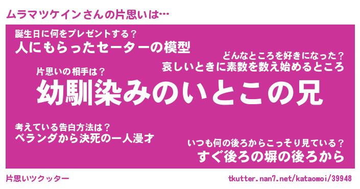 | 男性向けラノベタイトル風あだ名 | 『ムラマツケインの憂鬱』 |