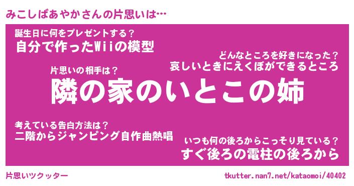 | 2回繰り返すあだ名 | 『みこみこ』『みみここ』『のろのろ』 |