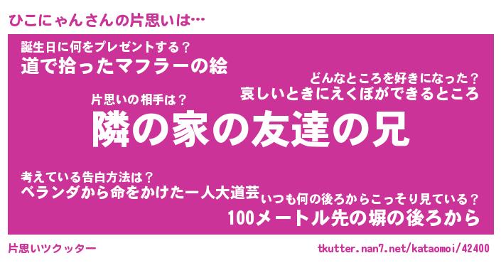 | 男性向けラノベタイトル風あだ名 | 『ひこにゃんの憂鬱』 |