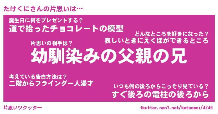 | ヘコむあだ名 | 『たけふぇ~』『なまこ酢』『たけを』 |