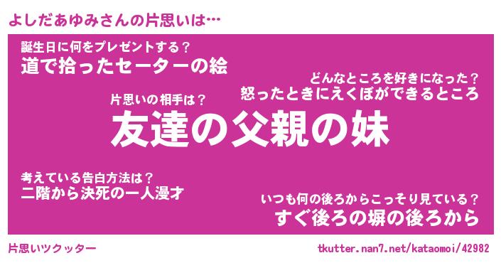 | 胡散臭い通販商品みたいなあだ名 | 『億万長者になれるブレスレット…その名も「よしだあゆみ」』 |