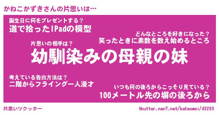 | 男性向けラノベタイトル風あだ名 | 『かねこかずきの憂鬱』 |