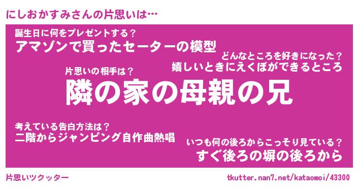 | 男性向けラノベタイトル風あだ名 | 『にしおかすみの憂鬱』 |