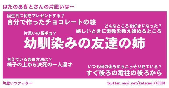 | ヘコむあだ名 | 『はたっふぃ~』『つくし』『はたを』 |