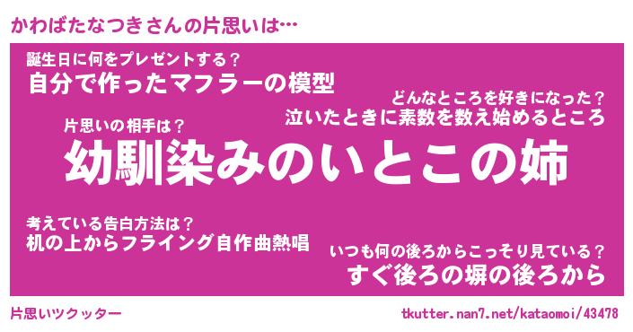 | 男性向けラノベタイトル風あだ名 | 『かわばたなつきの憂鬱』 |