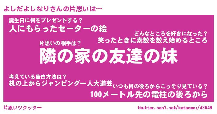 | ヘコむあだ名 | 『よしっふぃ~』『牛乳』『よしを』 |