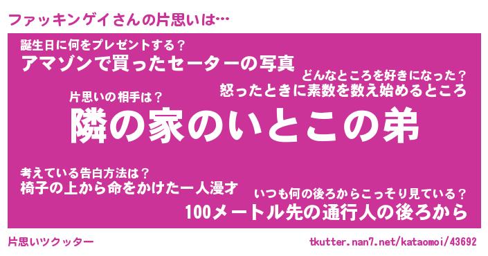 | 男性向けラノベタイトル風あだ名 | 『ファッキンゲイの憂鬱』 |