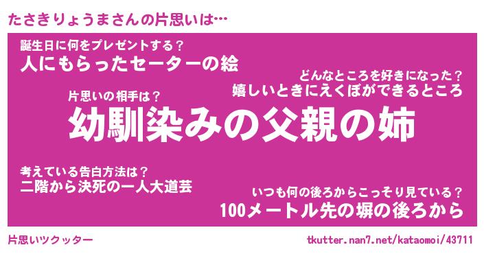 | 男性向けラノベタイトル風あだ名 | 『たさきりょうまの憂鬱』 |