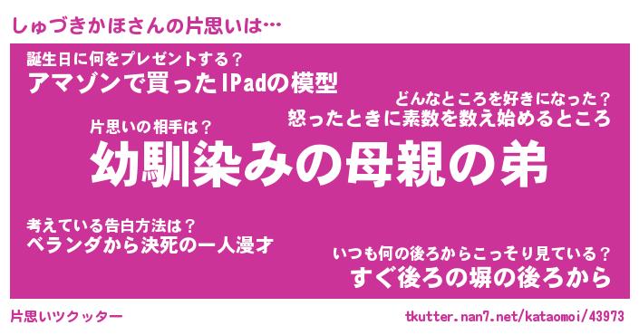 | ヘコむあだ名 | 『しゅにー』『なまこ酢』『しゅ太郎』 |