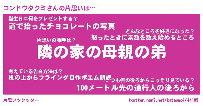 | 胡散臭い通販商品みたいなあだ名 | 『必ず成功するブレスレット…その名も「コンドウタクミ」』 |