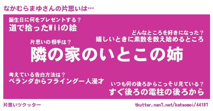 | 女子向けラノベタイトル風あだ名 | 『(仮)なかむらまゆのやんごとなき事情』 |