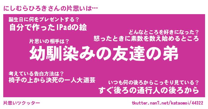 | ヘコむあだ名 | 『にしっふぃ~』『つくし』 |