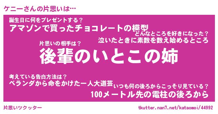 | ヘコむあだ名 | 『ケニにゅー』『なまこ酢』『ケニお』 |