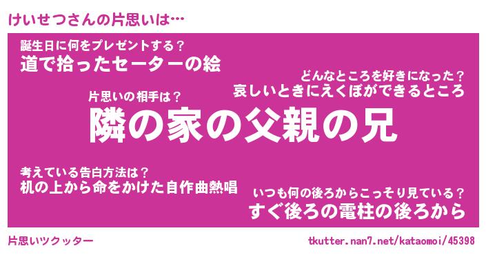 | 男性向けラノベタイトル風あだ名 | 『けいせつの憂鬱』 |