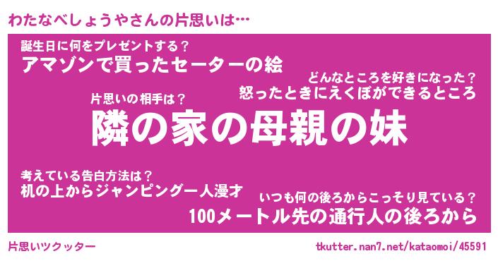 | 男性向けラノベタイトル風あだ名 | 『わたなべしょうやの憂鬱』 |