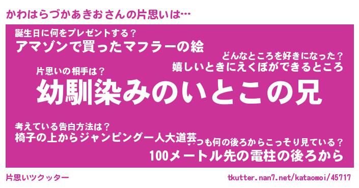 | 女子向けラノベタイトル風あだ名 | 『(仮)かわはらづかあきおのやんごとなき事情』 |
