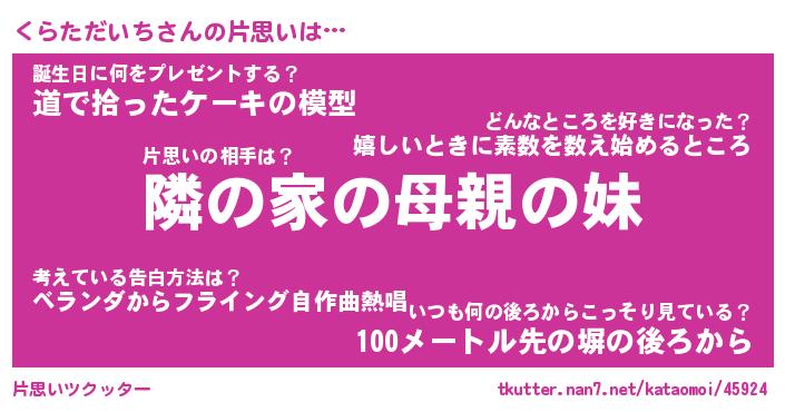 | 男性向けラノベタイトル風あだ名 | 『くらただいちの憂鬱』 |
