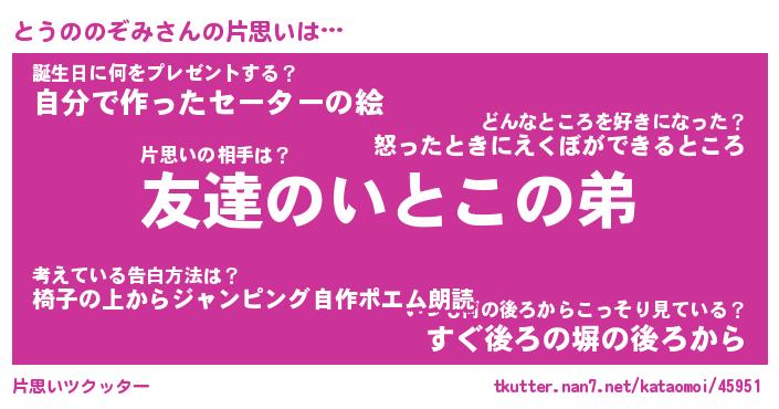 | ヒーロー風カッコイイあだ名 | 『スーパートウノノゾミ』『魔戒騎士トウ』 |