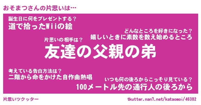 | 胡散臭い通販商品みたいなあだ名 | 『億万長者になれるブレスレット…その名も「おそまつ」』 |