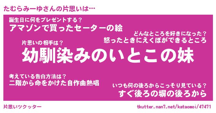 | 女子向けラノベタイトル風あだ名 | 『(仮)たむらみーゆのやんごとなき事情』 |