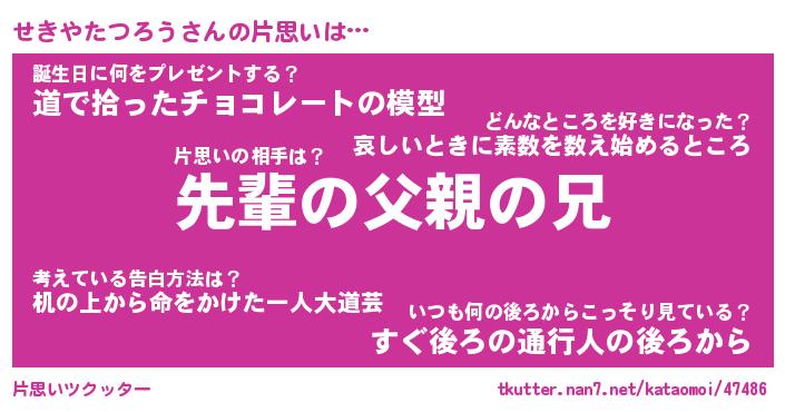 | 男性向けラノベタイトル風あだ名 | 『せきやたつろうの憂鬱』 |