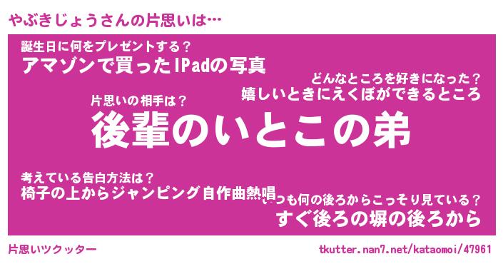 | ヘコむあだ名 | 『やぶにゅー』『つくし』『やぶっぺ』 |
