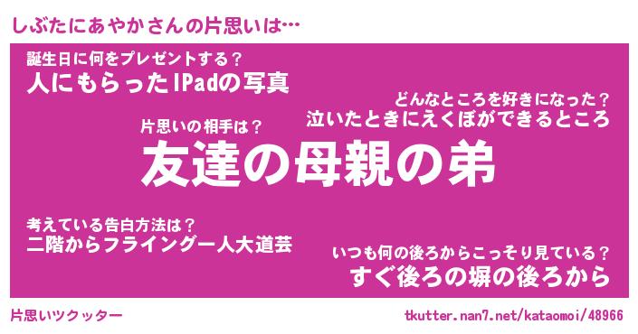 | 胡散臭い通販商品みたいなあだ名 | 『億万長者になれるブレスレット…その名も「しぶたにあやか」』 |