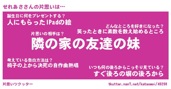 | 男性向けラノベタイトル風あだ名 | 『せれあさの憂鬱』 |