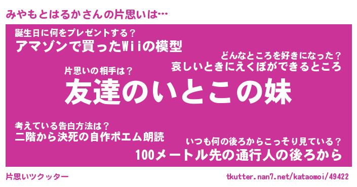 | 女子向けラノベタイトル風あだ名 | 『誰かこのみやもとはるかを説明してください! ~契約から始まるウェディング~』 |