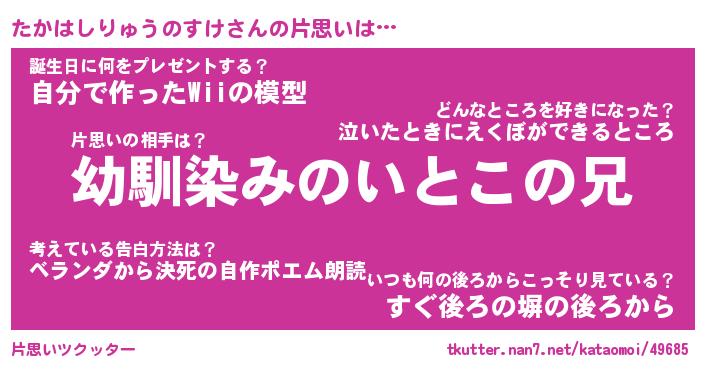 | 女子向けラノベタイトル風あだ名 | 『(仮)たかはしりゅうのすけのやんごとなき事情』 |