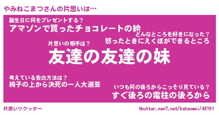 | 女子向けラノベタイトル風あだ名 | 『誰かこのやみねこまつを説明してください! ~契約から始まるウェディング~』 |
