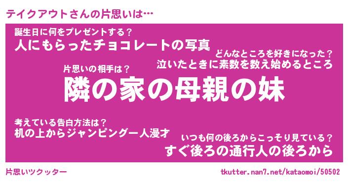 | 男性向けラノベタイトル風あだ名 | 『テイクアウトの憂鬱』 |