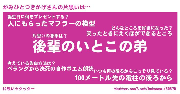 | 伝説のあだ名 | 『封印されしスナイパーかみひとつきかげ』 |