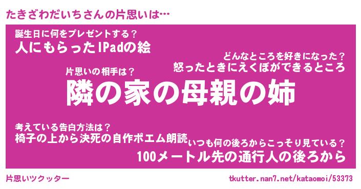 | 男性向けラノベタイトル風あだ名 | 『たきざわだいちの憂鬱』 |
