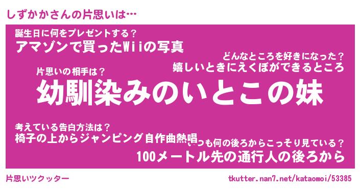 | ファンタジー風あだ名 | 『シズフェル』『エターナルシズカカー』 |