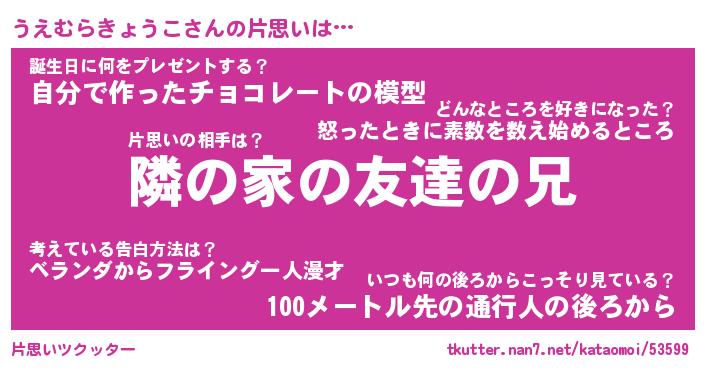 | 女子向けラノベタイトル風あだ名 | 『(仮)うえむらきょうこのやんごとなき事情』 |