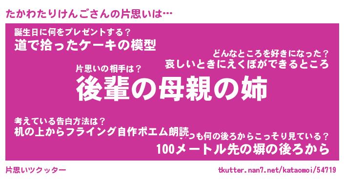 | ツイッター | たかわたりけんごさんのツイッターID『dendenmushi_man』 |
